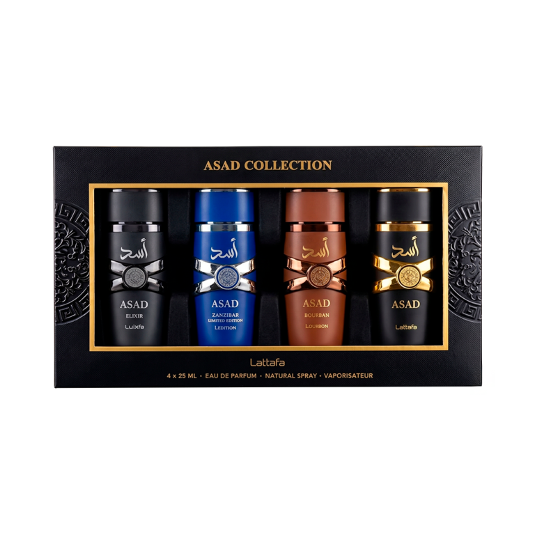 El set de Lattafa Asad Collection EDP reúne cuatro presentaciones de 25ml de línea Asad. Con una estela intensa y