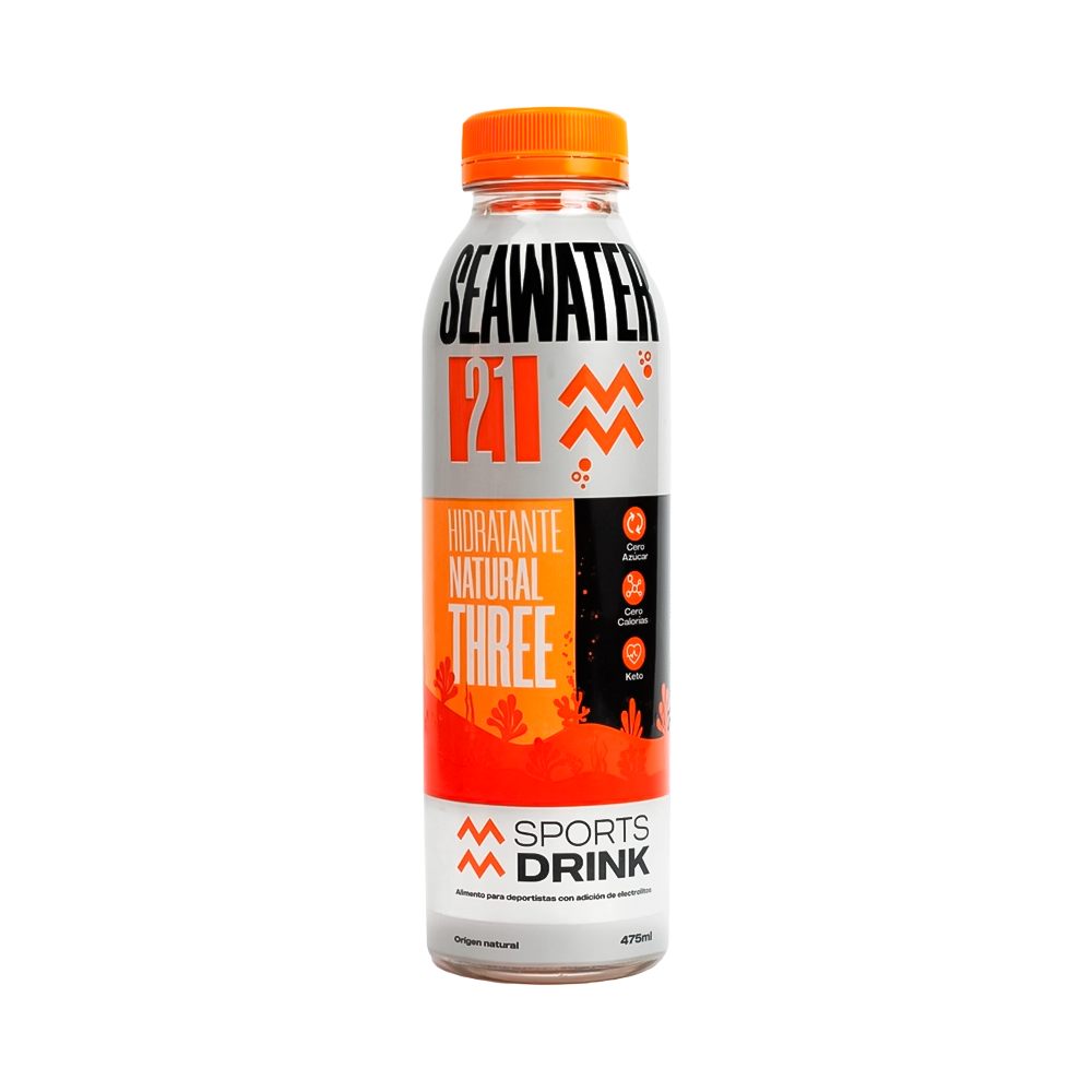 Seawater 21 Three es una bebida isotónica natural de origen chileno, elaborada con agua de mar profunda que aporta 21 minerales esenciales para una hidratación avanzada y recuperación muscular. Destaca por su intenso sabor a maracuyá, es totalmente libre de azúcar, calorías y colorantes artificiales, lo que la hace apta para dietas Keto y celíacos. Su fórmula busca optimizar el rendimiento físico de forma saludable, utilizando solo ingredientes naturales y endulzantes como la estevia.