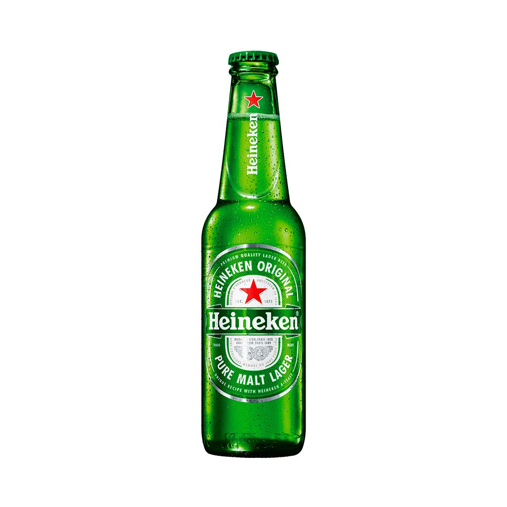 Esta es una Heineken Original, una cerveza tipo Lager de calidad premium presentada en su característica botella de vidrio verde de 330 ml. Se distingue por su receta de malta pura, elaborada únicamente con ingredientes naturales como agua, cebada malteada y lúpulo, lo que le otorga su sabor equilibrado y refrescante con sutiles notas afrutadas. Su diseño es icónico a nivel mundial, resaltando la famosa estrella roja y la etiqueta circular que certifica su herencia cervecera desde 1873.
