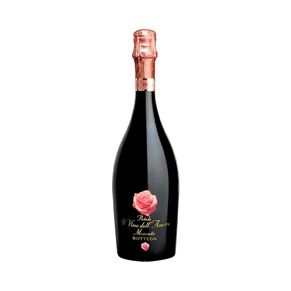 Con su buqué sensacional y elegante, el Petalo Vino dell´Amore Moscato Bottega se caracteriza por una dulzura no excesiva, por un contenido moderado de alcohol y por un aroma típico de rosas que evoca la imagen de los pétalos en la etiqueta. Un vino espumoso procedente de uvas moscatel cultivadas en las colinas. Se separa presionando ligeramente y se almacena a baja temperatura para evitar la fermentación.