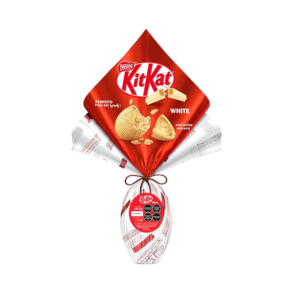 El Huevo de Pascua KitKat White ofrece una experiencia intensamente dulce y texturizada, caracterizada por una capa exterior de chocolate blanco cremoso con notas lácteas muy marcadas. Su principal atractivo es la inclusión de trozos de la emblemática oblea crujiente de la marca, los cuales están integrados directamente en la cáscara del huevo, proporcionando un contraste de texturas entre la suavidad del chocolate y el toque aireado y crocante de la galleta.