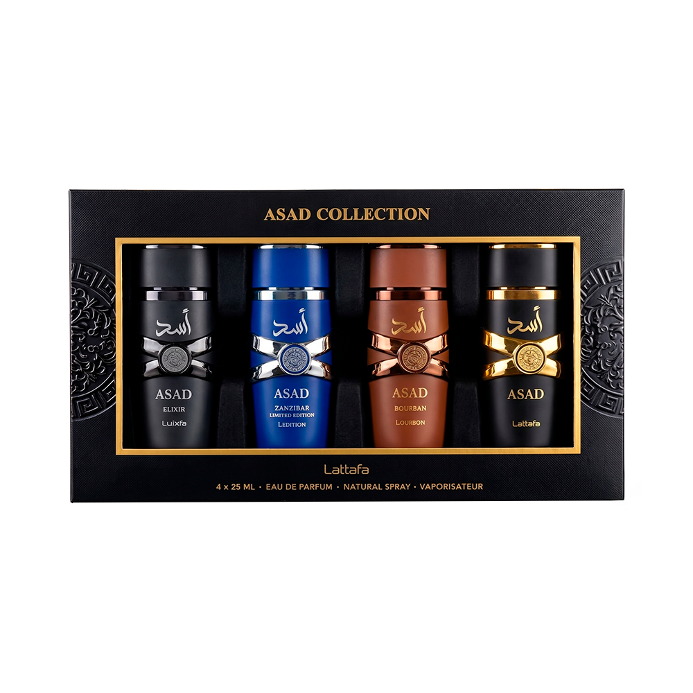 El set de Lattafa Asad Collection EDP reúne cuatro presentaciones de 25ml de línea Asad. Con una estela intensa y cautivadora, cada miniatura concentra la esencia de Asad. Ideal para quienes desean probar la fragancia, llevarla en el bolso o simplemente disfrutar de un set práctico y exclusivo, este kit garantiza una experiencia olfativa envolvente y de larga fijación en la piel.