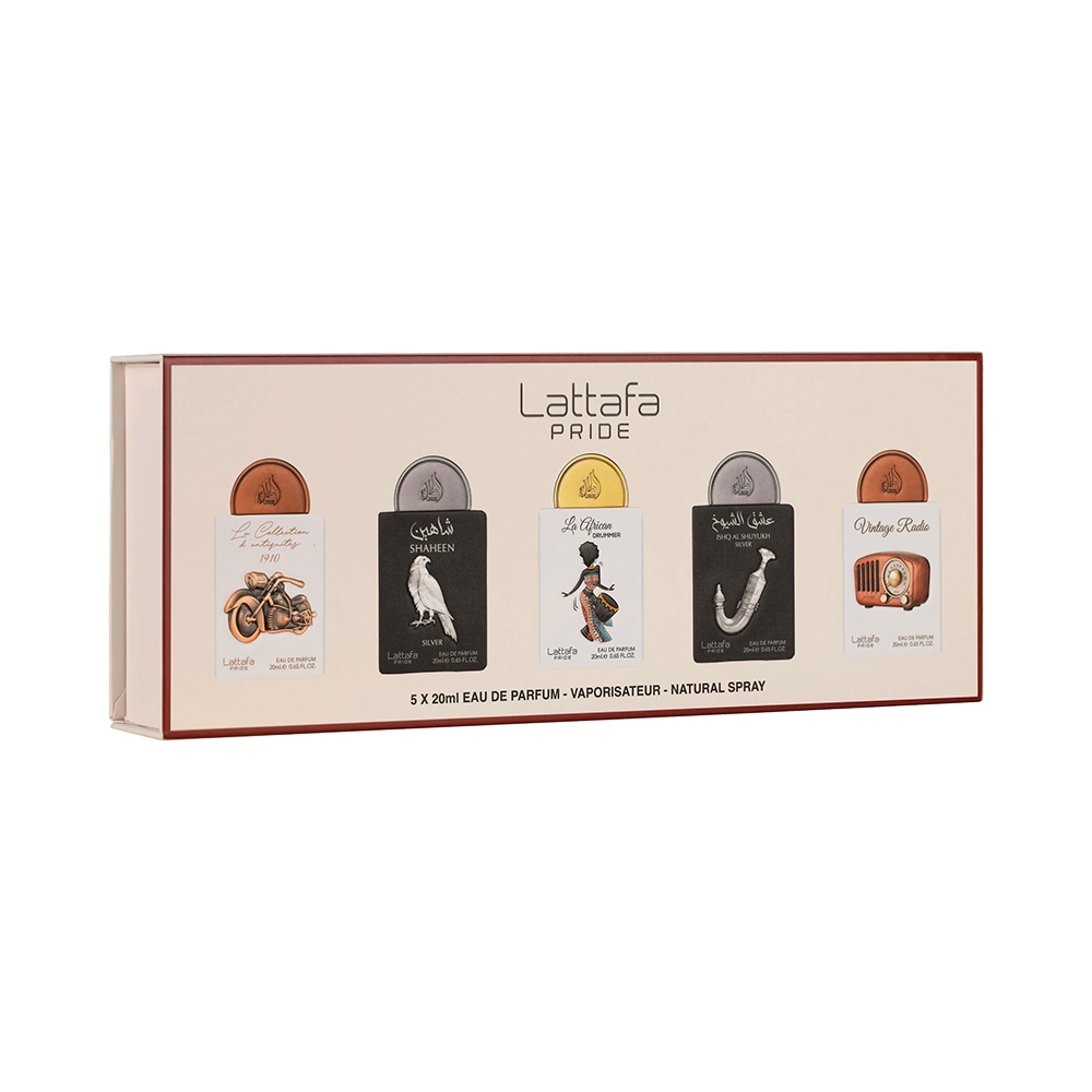 Incluyen: Lattafa Pride La Collection D’Antiquités 1910 – 20 ml,Lattafa Pride Shaheen Plata – 20 ml, Lattafa Pride La African Drummer – 20 ml, Lattafa Pride Ishq Al Shuyukh Plata – 20 ml, Radio vintage Lattafa Pride – 20 ml.