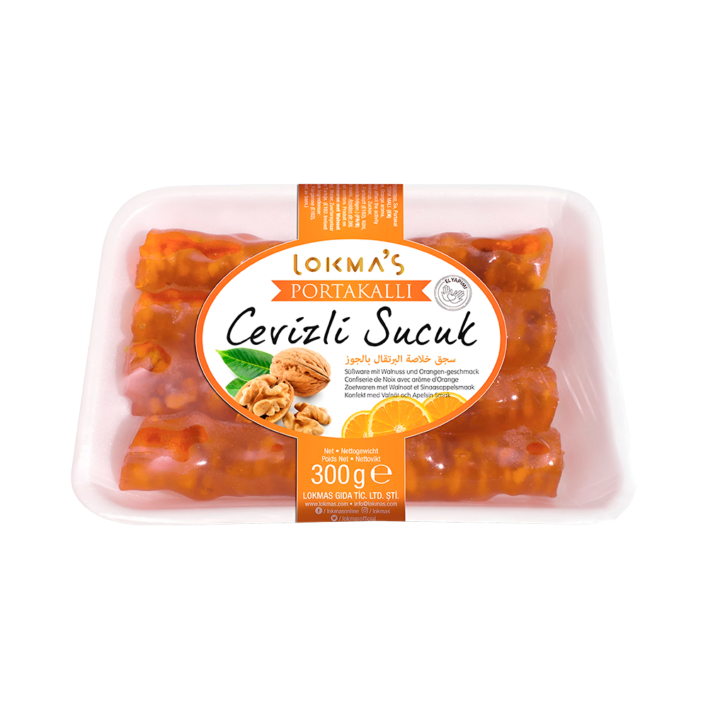 Lokma’s de Nuez y Naranja, presentada en un práctico paquete de 300g. Este postre tradicional está elaborado de nueces enteras sumergidos en un espeso y gelatinoso mosto concentrado de jugo de naranja, que se seca para crear una consistencia densa y masticable. La dulzura cítrica y refrescante de la naranja equilibra perfectamente la riqueza de la nuez, creando un snack o postre único que es una fuente natural de energía con el sabor vibrante de los cítricos.
