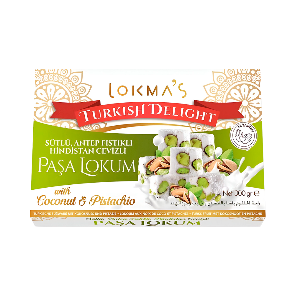 Lokma’s Delight con Coco y Pistacho en su presentación de 300g, una variedad de Turkish Delight que combina la suavidad característica del lokm’s con una riqueza de sabores. Cada porción envuelve la masa tierna con el dulce sabor y la ligera fragancia del coco rallado, que a menudo recubre una deliciosa crema de pistacho o incluye trozos de pistacho asado en su interior, brindando un contraste crujiente y una nota salada. Este deleite es un regalo visual y gustativo, ideal para los amantes de los sabores tropicales y frutos secos, perfecto para acompañar tu pausa para el té o para ofrecer un dulce gourmet y sofisticado.