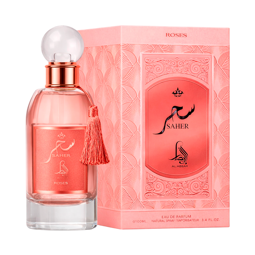 Saher Roses de Al Absar es una fragancia femenina que pertenece a la familia olfativa Ámbar Floral, diseñada para proyectar una imagen de elegancia, sensualidad y sofisticación moda, otorga una estela cautivadora y una excelente fijación en la piel, siendo ideal tanto para el uso diario como para ocasiones especiales.