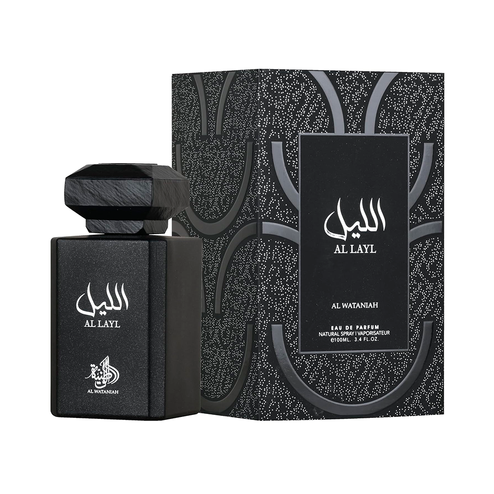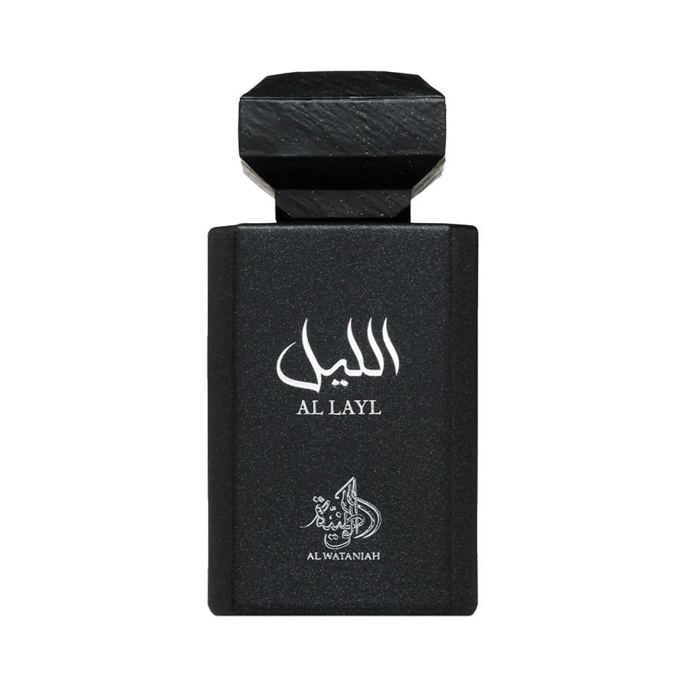 Al Wataniah Al Layl Eau de Parfum, es una cautivadora fragancia unisex oriental amaderada y especiada, diseñada para las noches y los días más frescos. Presenta una rica y acogedora mezcla de café, frutas dulces y suaves notas florales. Sus notas principales incluyen frambuesa, café y lavanda, que dan paso a un corazón de jazmín y rosa, con un cálido fondo de sándalo y almizcle.
