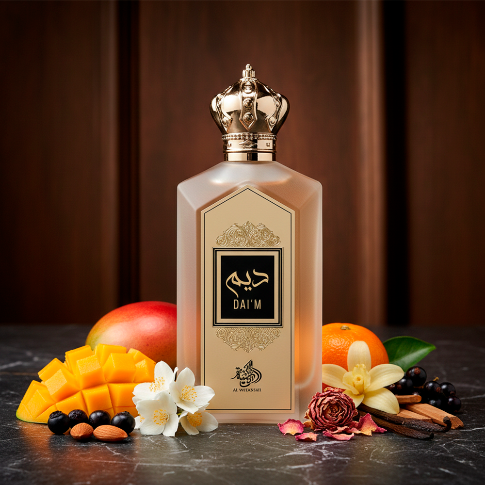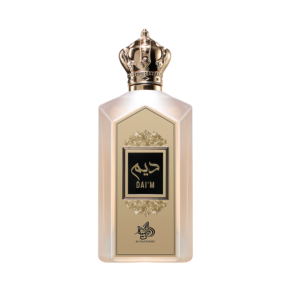 Al Wataniah Dai’m es una fragancia floral frutal cautivadora, diseñada para mujeres que transmiten encanto y sofisticación. La salida con mango, mandarina y grosella negra ofrece frescura vibrante. En el corazón, almendra, jazmín y rosa aportan feminidad delicada. El fondo de sándalo, vainilla y almizcle asegura sensualidad, elegancia y larga duración.