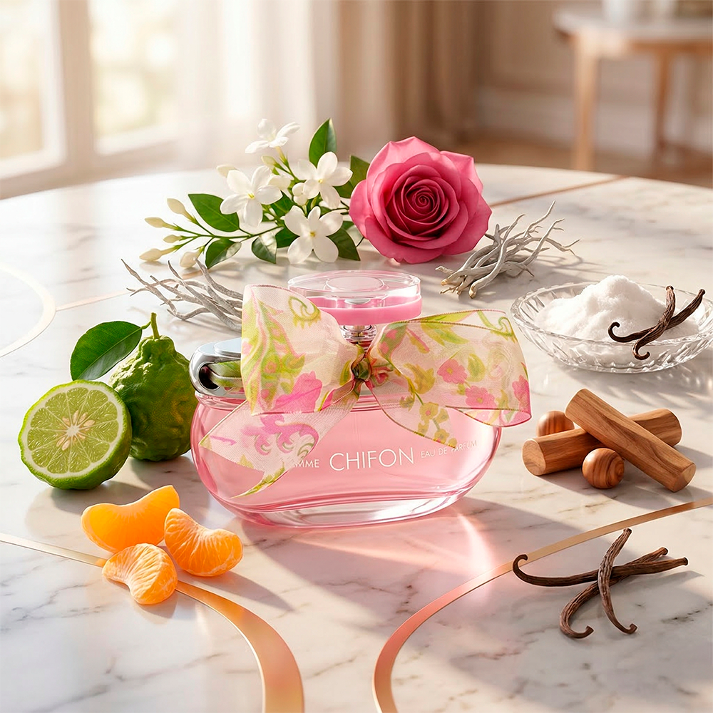 Inesperada e inconfundible, Chifón es una fragancia profundamente fresca, con un toque de inocencia y dulzura, de aire veraniego, ilumina tu día. El lazo de gasa cuidadosamente atado le confiere una sensación de pureza y delicadeza.
