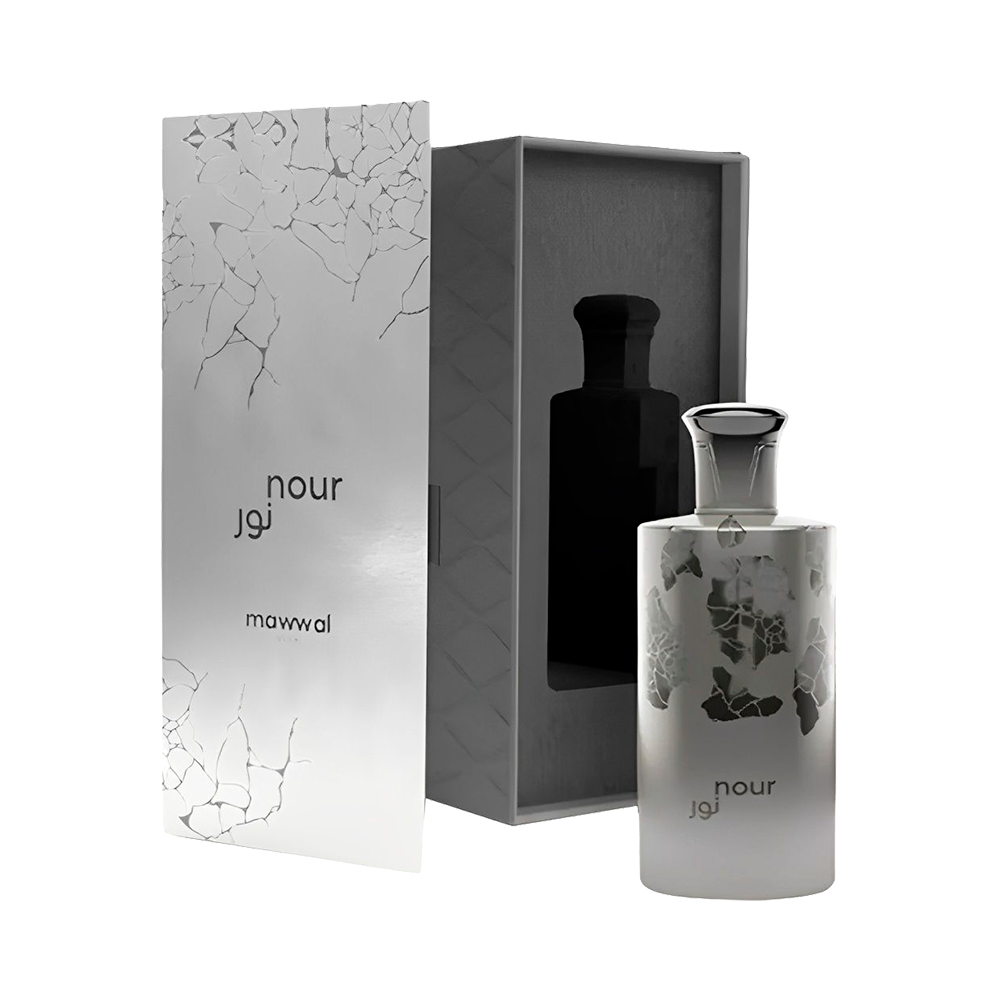 Perfume Mawwal con un destello de fuego, el roce de un amante, una chispa de rebeldía. Nour despierta tus sentidos, un aroma cautivador que arde con confianza y enciende la noche.