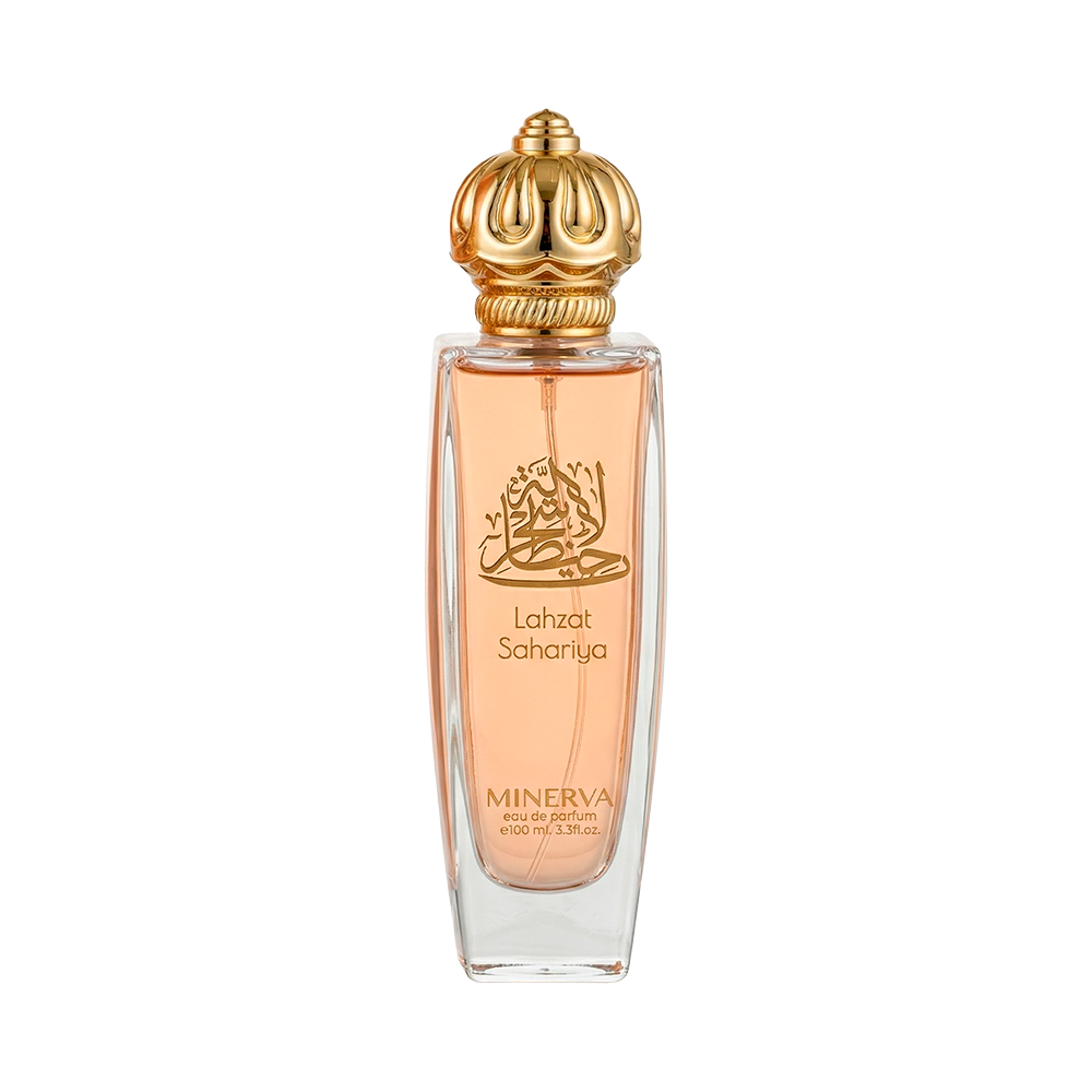 Lahzat Sahariya de Minerva, es una fragancia femenina que destaca por su estética de inspiración árabe, con un frasco elegante coronado por un tapón dorado en forma de cúpula y detalles de caligrafía. Pertenece a la familia olfativa floral frutal, ofreciendo una apertura fresca de lichi y frambuesa que evoluciona hacia un corazón romántico de rosa y jazmín, para finalmente asentarse en una base cálida y profunda de ámbar, almizcle y vainilla. Es un perfume diseñado para transmitir misterio y sofisticación, evocando la atmósfera exótica del desierto con una estela intensa y duradera.