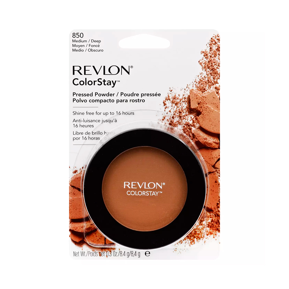 Es un polvo compacto facial Revlon ColorStay en tono medio/oscuro 850, diseñado para ofrecer un acabado mate, suave y uniforme que ayuda a controlar el brillo del rostro a lo largo del día.