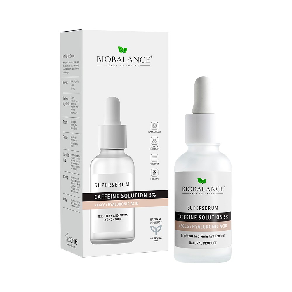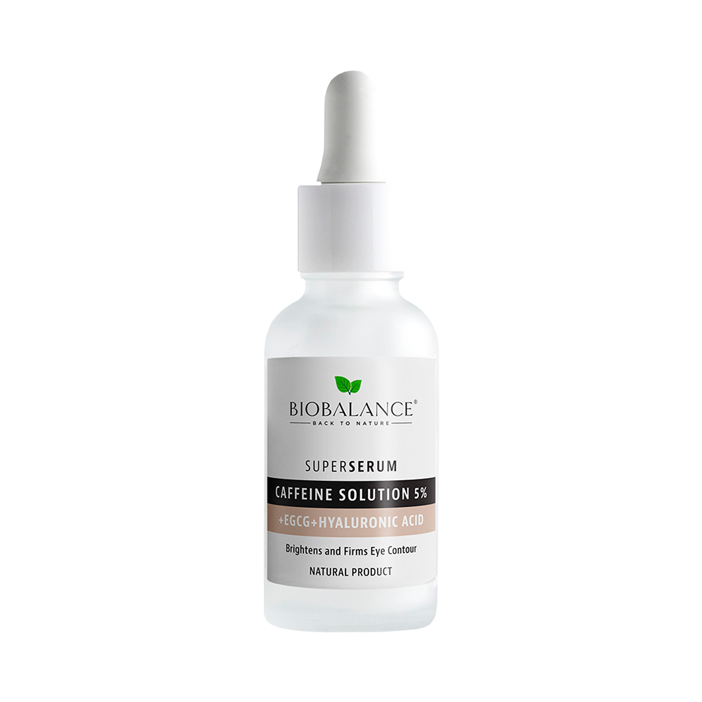 Bio Balance Super Serum Solución de Cafeína 5% + EGCG + Acido Hialurónico 30ml. Es un serum para el cuidado de los ojos, con su eficaz formula con cafeína, combate las ojeras y la hinchazón del contorno de ojos. Mejora la apariencia de la piel del contorno de ojos, dejándola
